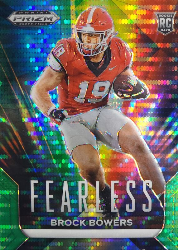 The Brock Bowers 2024 Prizm Draft Picks #F-BB Fearless - Green Pulsar /25 Rookie card in Raw condition has not changed in price in the last 30 days and was last sold for $22.00 .