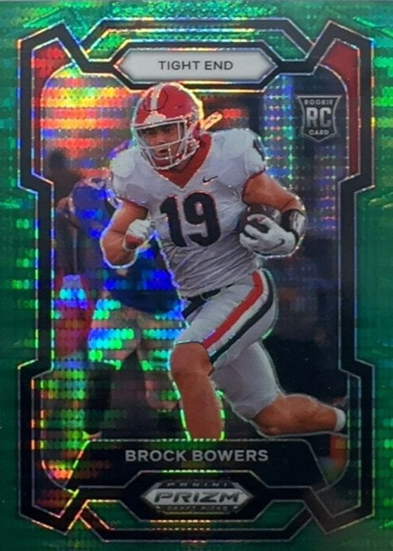 The Brock Bowers 2024 Prizm Draft Picks #107 Green Pulsar /25 Rookie card in Raw condition has not changed in price in the last 30 days and was last sold for $14.50 .