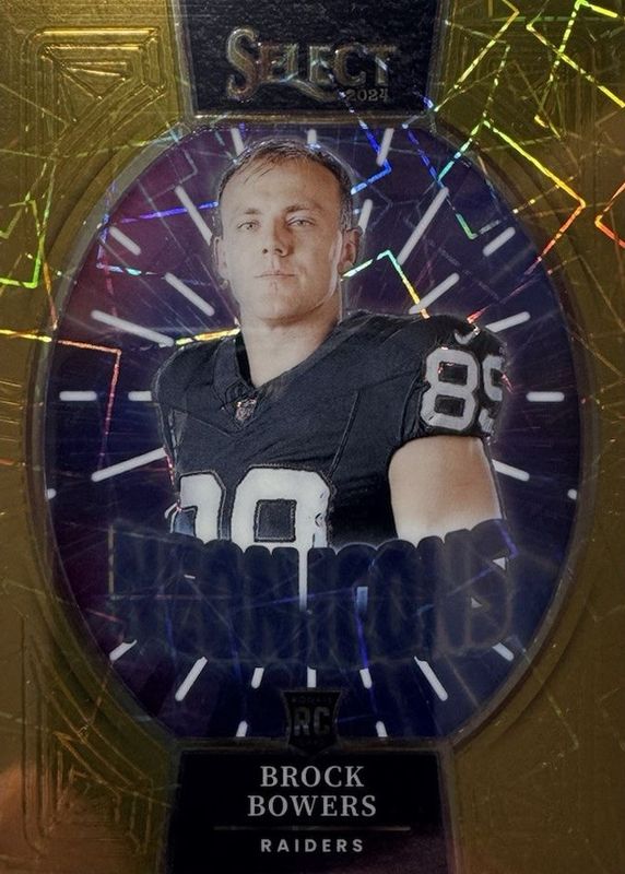 The Brock Bowers 2024 Select #16 Neon Icons - Gold /10 Rookie card in Raw condition has not changed in price in the last 30 days and was last sold for $315.00 .