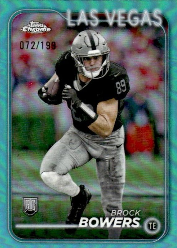 The Brock Bowers 2024 Topps Chrome #207 Aqua Refractor /199 Rookie card in Raw condition has moved up $0.01 (+0.2%) in the last 30 days and was last sold for $6.51 .