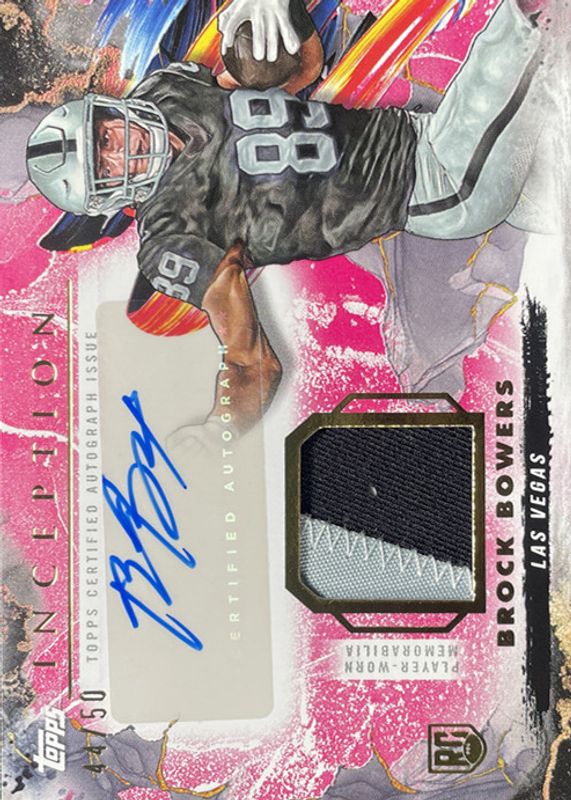 The Brock Bowers 2024 Topps Inception #PPA-BB Provenance Patch Autographs - Orange /50 Rookie card in Raw condition has not changed in price in the last 30 days and was last sold for $183.50 .