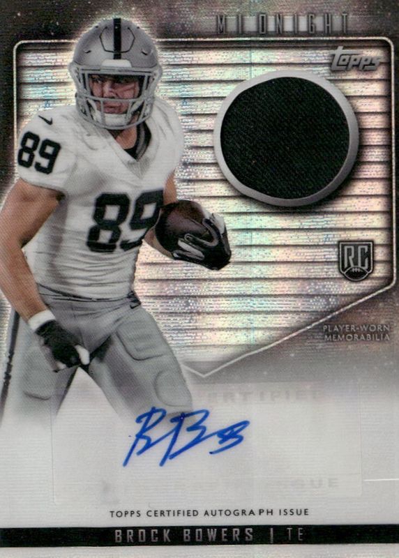 The Brock Bowers 2024 Topps Midnight #RJA-BB Rookie Jersey Autographs - Moon Beam card in Raw condition has not changed in price in the last 30 days and was last sold for $85.00 .