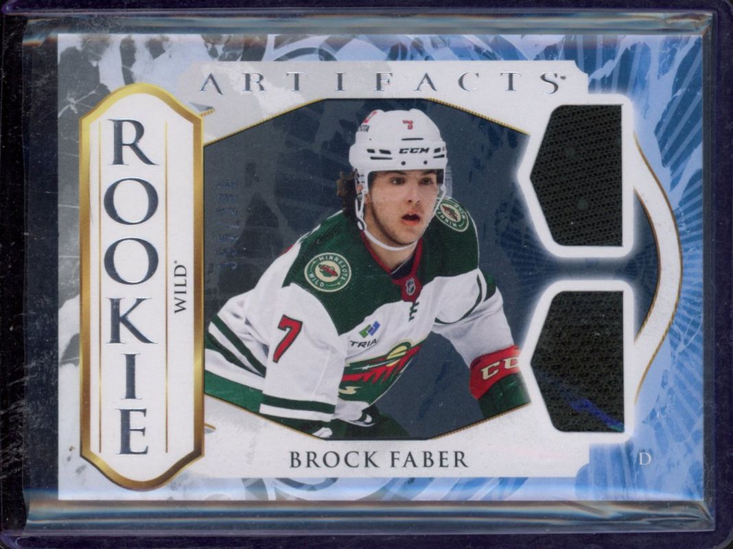 The Brock Faber 2023 Upper Deck Artifacts #189 Plexi Rookie card is 1 of 40 Brock Faber's card variations in the 2023 Upper Deck Artifacts set being tracked by Sports Card Investor, including Base /999, Leather, Turquoise, Wood, and Ruby /499.