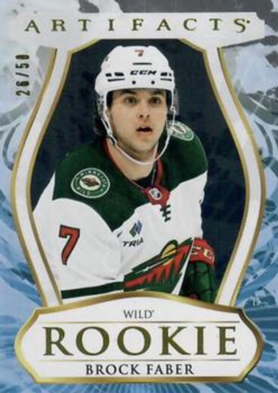 The Brock Faber 2023 Upper Deck Artifacts #189 Yellow /50 Rookie card is 1 of 40 Brock Faber's card variations in the 2023 Upper Deck Artifacts set being tracked by Sports Card Investor, including Base /999, Leather, Plexi, Turquoise, and Wood.