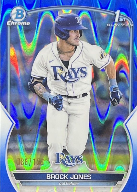 The Brock Jones 2023 Bowman #BCP-115 Chrome Prospects - Blue RayWave Refractor /150 (1st) card in Raw condition has not changed in price in the last 30 days and was last sold for $4.00 .