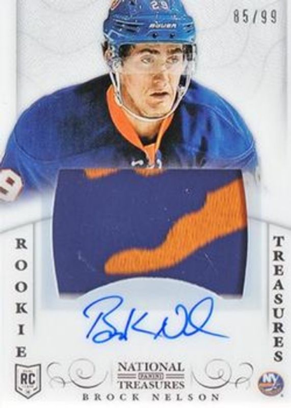 The Brock Nelson 2013 National Treasures #137 Base /99 Rookie card is 1 of 19 Brock Nelson's card variations in the 2013 National Treasures set being tracked by Sports Card Investor, including Rainbow /21, Rookie Jumbo Jerseys Booklet Autographs /99, Colossal Jerseys /50, Rookie Jumbo Prime Booklet Autographs /49, and Colossal Jerseys Autographs /25.