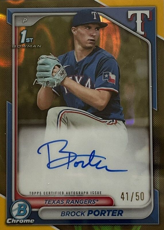 The Brock Porter 2024 Bowman #CPA-BP Chrome Prospect Auto - Gold Lava Refractor /50 (1st) card in Raw condition has not changed in price in the last 30 days and was last sold for $49.99 .