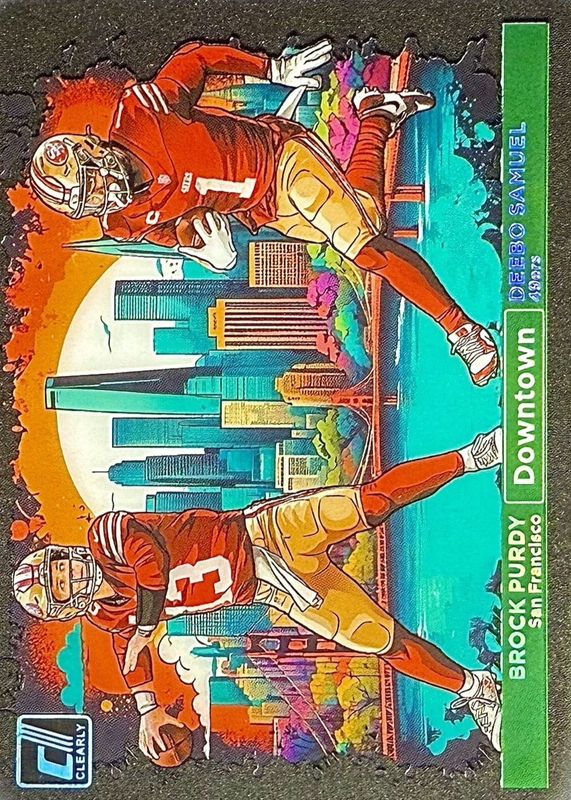 This card is 1 of 2 Brock Purdy / Deebo Samuel's card variations in the 2024 Clearly Donruss set being tracked by Sports Card Investor, including Downtown Duos - Platinum /1.