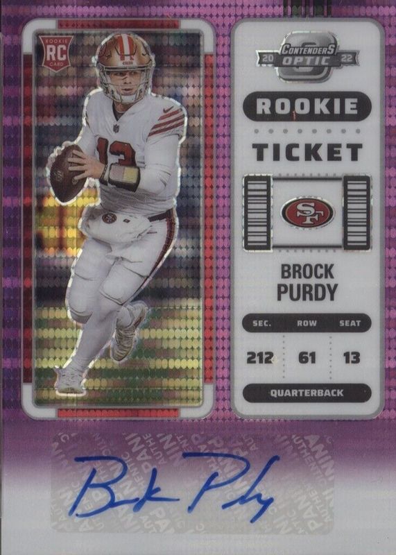 Auctions Ending Soon for Brock Purdy 2022 Contenders Optic #146 Rookie Ticket Auto - Purple Pulsar /21 RAW