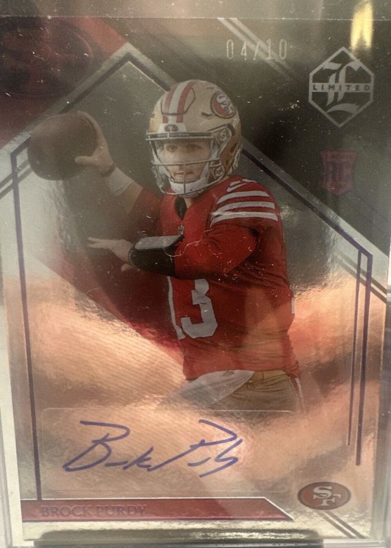 This card is 1 of 9 Brock Purdy's card variations in the 2022 Limited set being tracked by Sports Card Investor, including 2004 Tribute Rookies, 2004 Tribute Rookies - Limited Edition, Autographs /99, Autographs - Silver Spotlight /75, and Autographs - Gold Spotlight /49.