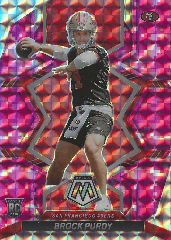 The Brock Purdy 2022 Mosaic #367 Pink Camo Rookie card in Raw condition has moved up $7.99 (+47.0%) in the last 30 days and was last sold for $24.99 .