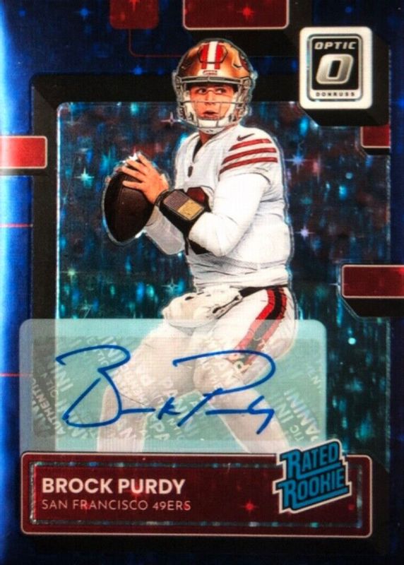 The Brock Purdy 2022 Optic #277 Rated Rookie Autographs - Purple Stars (/10) card in Raw condition has not changed in price in the last 30 days and was last sold for $1,603.19 .