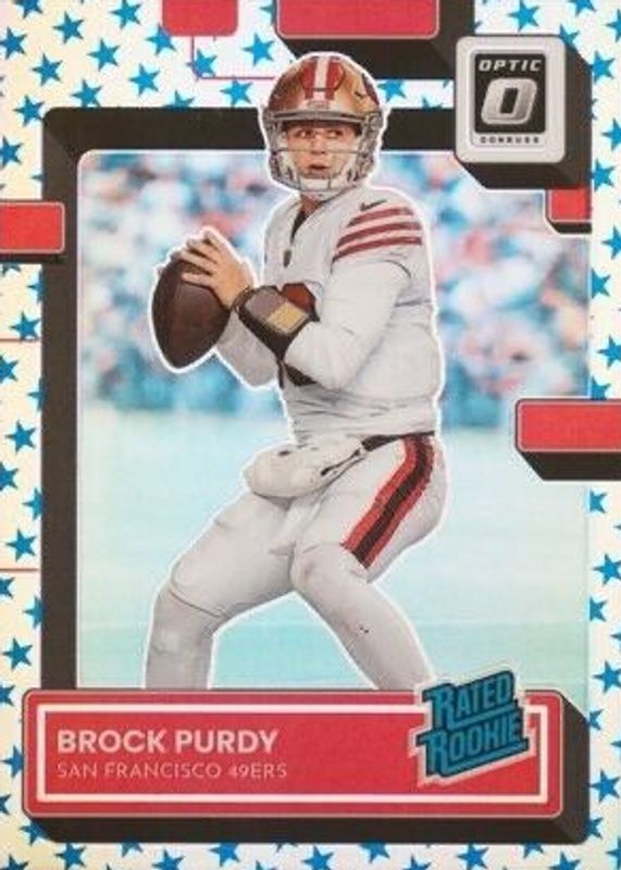 The Brock Purdy 2022 Optic #277 Stars /(SSP) Rookie card in Raw condition has moved up $72.01 (+240%) in the last 30 days and was last sold for $102.00 .
