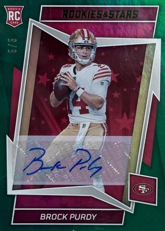The Brock Purdy 2022 Rookies & Stars #145 Rookie Signatures - Green /5 card in Raw condition has not changed in price in the last 30 days and was last sold for $1,250.00 .
