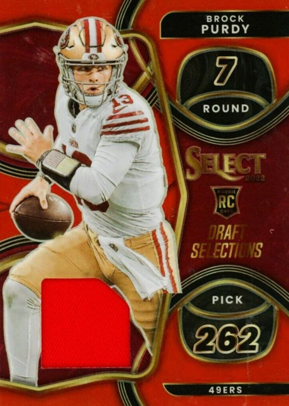 The Brock Purdy 2022 Select #DS-24 Draft Selections Memorabilia - Red Rookie card in Raw condition has moved up $15.00 (+42.9%) in the last 30 days and was last sold for $50.00 .