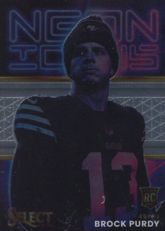 The Brock Purdy 2022 Select #NI-15 Neon Icons Rookie card in Raw condition has moved down -$7.50 (-50.0%) in the last 30 days and was last sold for $7.50 .