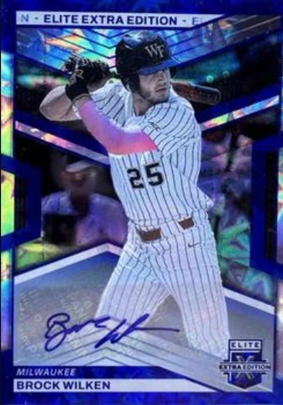 The Brock Wilken 2023 Elite Extra Edition #33 Blue Signatures /20 card is 1 of 131 Brock Wilken's card variations in the 2023 Elite Extra Edition set being tracked by Sports Card Investor, including #33 Base, #166 Base, #166 Pink, #33 Pink, and #33 Signatures.