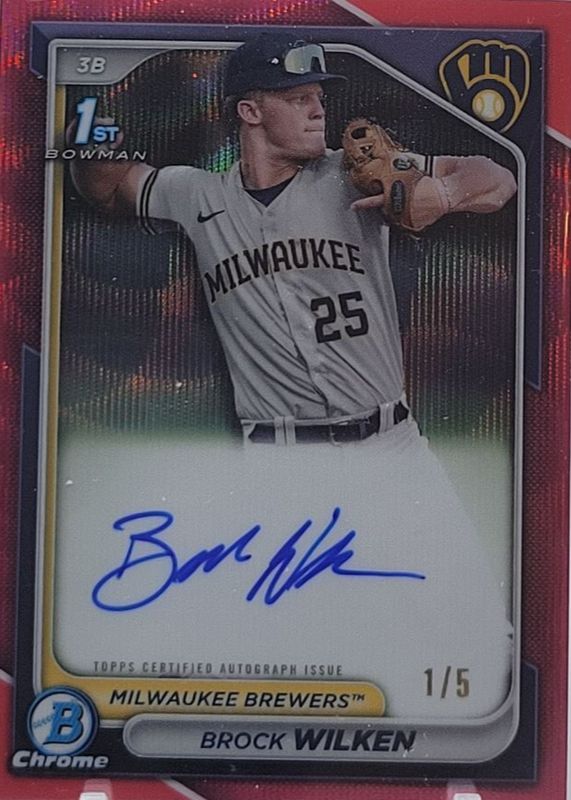 The Brock Wilken 2024 Bowman #CPA-BW Chrome Prospect Auto - Red Wave Refractor /5 (1st) card in Raw condition has not changed in price in the last 30 days and was last sold for $893.79 .