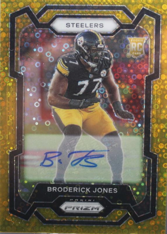 The Broderick Jones 2023 Prizm #385 Rookie Autographs - No Huddle Gold /10 card in Raw condition has not changed in price in the last 30 days and was last sold for $47.00 .