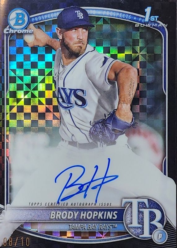 The Brody Hopkins 2025 Bowman #CPA-BH Chrome Prospect Auto - Black X-Fractor /10 (1st) card in Raw condition has not changed in price in the last 30 days and was last sold for $222.50 .
