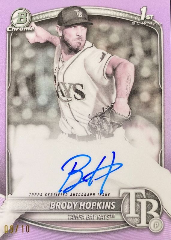 The Brody Hopkins 2025 Bowman #CPA-BH Chrome Prospect Auto - Pearl Refractor /10 (1st) card in Raw condition has not changed in price in the last 30 days and was last sold for $202.50 .