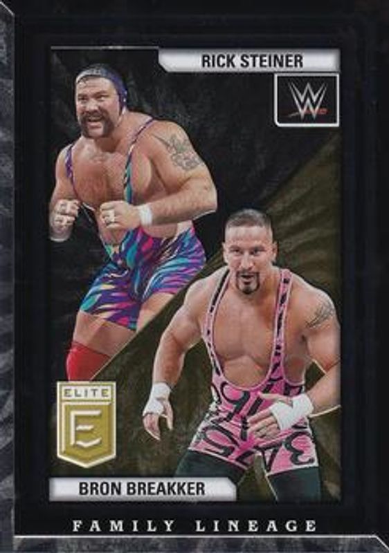 The Bron Breakker / Rick Steiner 2023 Elite WWE #6 Family Lineage card is 1 of 10 Bron Breakker / Rick Steiner's card variations in the 2023 Elite WWE set being tracked by Sports Card Investor, including Family Lineage - Green, Family Lineage - Red /99, Family Lineage - Orange /49, Family Lineage - Teal /25, and Passing the Torch Signatures /25.