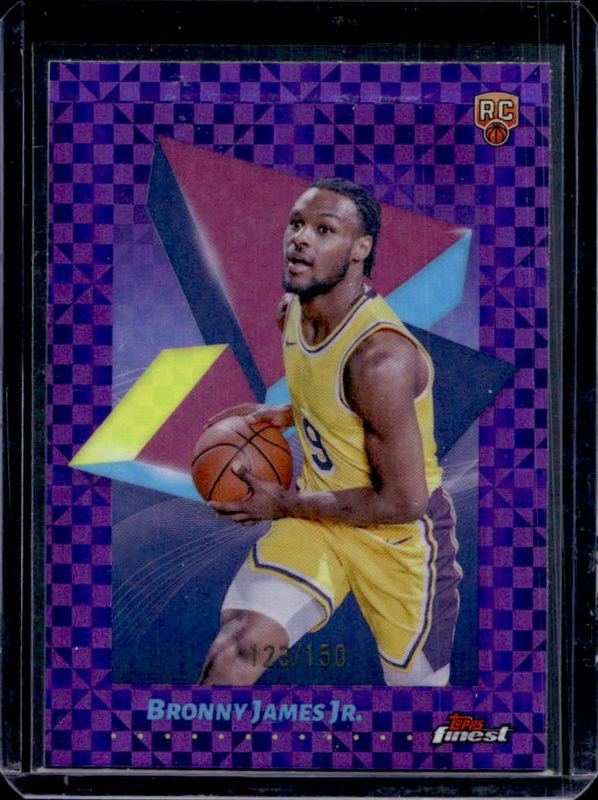 The Bronny James Jr. 2024 Topps Finest #43 Base Common - Purple X-Fractor /150 Rookie card is 1 of 135 Bronny James Jr.'s card variations in the 2024 Topps Finest set being tracked by Sports Card Investor, including Arrivals, Arrivals - Geometric Refractor, Arrivals - Refractor, Arrivals - X-Fractor, and Base Common.