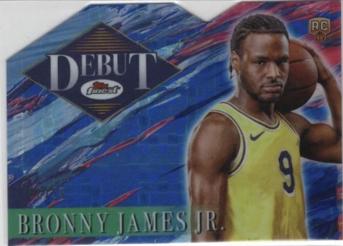 The Bronny James Jr. 2024 Topps Finest #D-2 Debut - Blue X-Fractor /99 Rookie card is 1 of 135 Bronny James Jr.'s card variations in the 2024 Topps Finest set being tracked by Sports Card Investor, including Arrivals, Arrivals - Geometric Refractor, Arrivals - Refractor, Arrivals - X-Fractor, and Base Common.