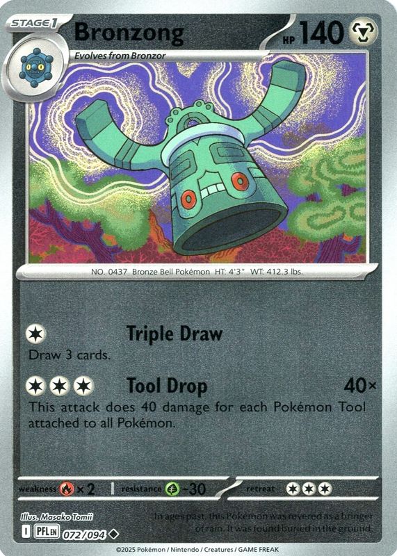 The Bronzong 2025 Mega Evolution: Phantasmal Flames #72/94 Reverse Holo card in Raw TCG (Near Mint) condition has moved up $0.05 (+4.0%) in the last 30 days and was last sold for $1.30 .