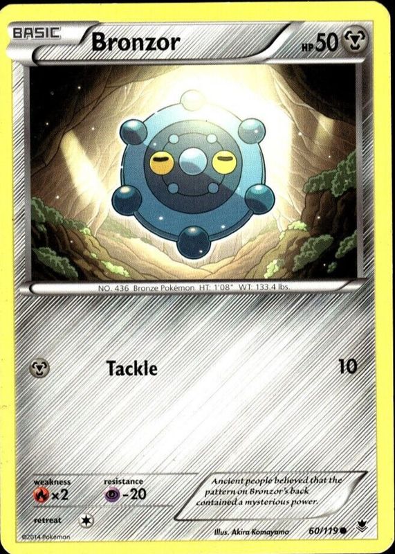 The Bronzor 2014 XY: Phantom Forces #060/119 Base card in Raw TCG (Near Mint) condition has not changed in price in the last 30 days and was last sold for $0.99 .