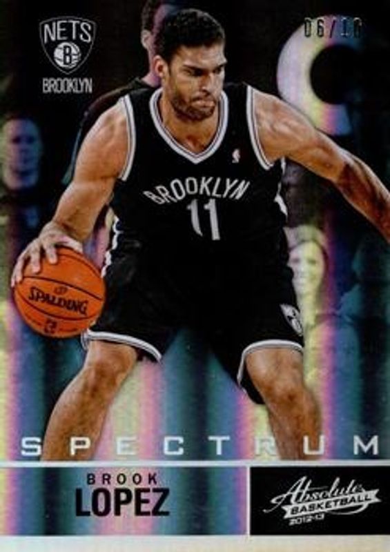 The Brook Lopez 2012 Absolute #49 Spectrum Platinum /10 card is 1 of 11 Brook Lopez's card variations in the 2012 Absolute set being tracked by Sports Card Investor, including Base /399, Spectrum Gold /25, Spectrum Black /1, Frequent Flyer Autographs /99, and Iconic Materials Autographs /74.