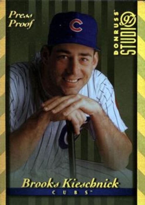 The Brooks Kieschnick 1997 Donruss Studio #153 Press Proof Gold Rookie card is 1 of 3 Brooks Kieschnick's card variations in the 1997 Donruss Studio set being tracked by Sports Card Investor, including Base, and Press Proof Silver.