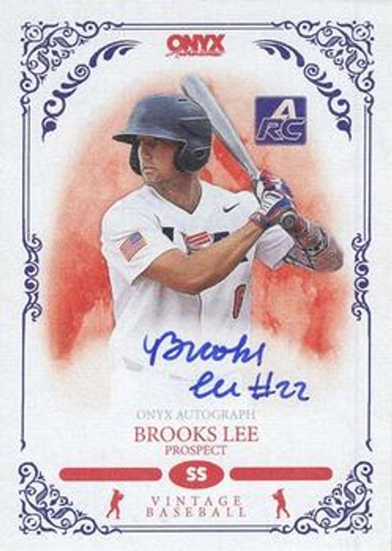 The Brooks Lee 2022 Onyx Vintage Extended #VABL Blue Signatures card is 1 of 6 Brooks Lee's card variations in the 2022 Onyx Vintage Extended set being tracked by Sports Card Investor, including Base, Green Signatures, Red Signatures, Green /50, and Black Signatures /5.