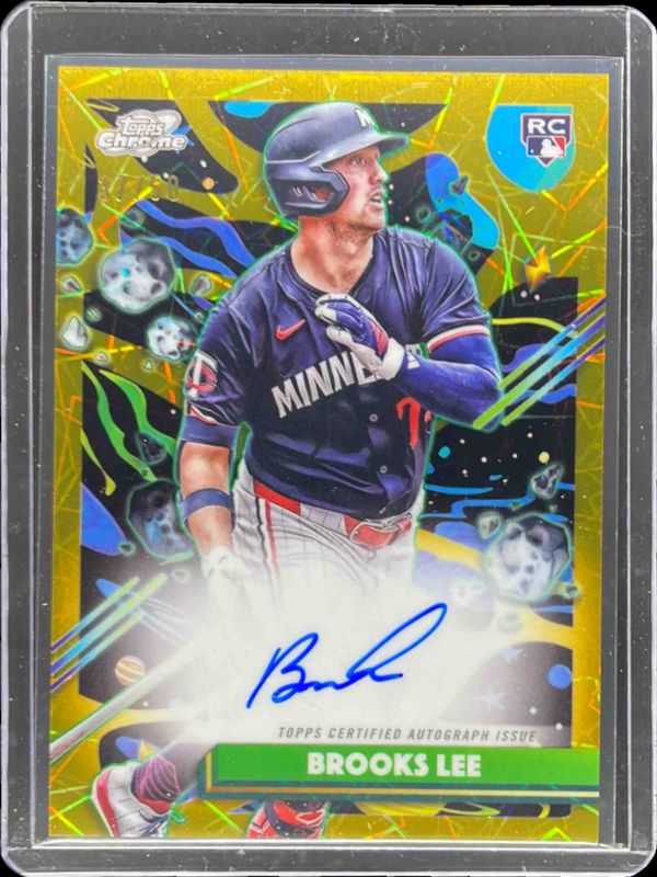 The Brooks Lee 2025 Topps Chrome Cosmic #CCA-BL Autographs - Gold Interstellar Refractor /50 Rookie card is 1 of 54 Brooks Lee's card variations in the 2025 Topps Chrome Cosmic set being tracked by Sports Card Investor, including Base, Nucleus Refractor, Refractor, Aqua Equinox Refractor /199, and Purple Nebula Refractor /150.