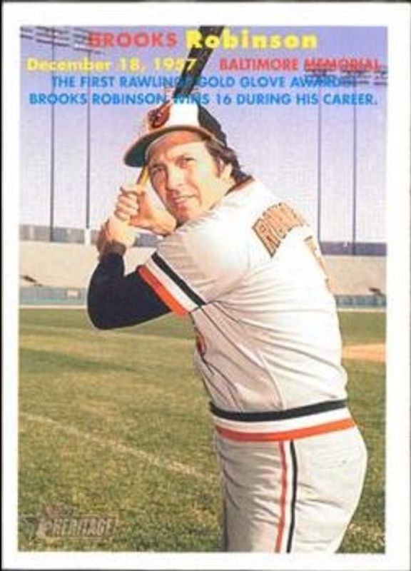 The Brooks Robinson 2006 Topps Heritage #FB-BR Flashbacks card is 1 of 6 Brooks Robinson's card variations in the 2006 Topps Heritage set being tracked by Sports Card Investor, including Clubhouse Collection Relics, Flashbacks Autographs, Flashbacks Autographs Seat Relics, Flashbacks Seat Relics, and Clubhouse Collection Autographs Relics /25.