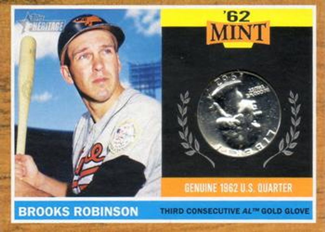 The Brooks Robinson 2011 Topps Heritage #62M-BR 62 Mint Coins card is 1 of 10 Brooks Robinson's card variations in the 2011 Topps Heritage set being tracked by Sports Card Investor, including Player Samples, Baseball Flashbacks, Flashback Stadium Relic Autographs, Flashback Stadium Relics, and Framed 1962 Stamps Buybacks.