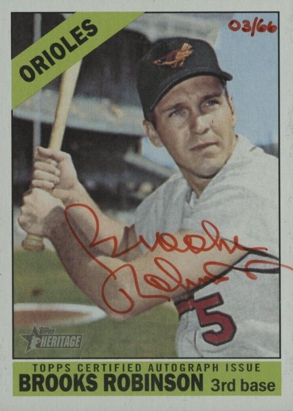 The Brooks Robinson 2015 Topps Heritage #ROA-BRO Real One Autographs - Red Ink /66 card in Raw condition has not changed in price in the last 30 days and was last sold for $187.50 .