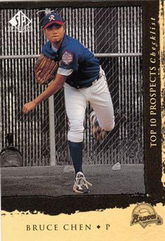 The Bruce Chen 1999 SP Top Prospects #10 Base Rookie card is 1 of 7 Bruce Chen's card variations in the 1999 SP Top Prospects set being tracked by Sports Card Investor, including #27 Base, #10 President's Edition /10, #27 President's Edition /10, #BC Chirography, and #GF8 Great Futures.