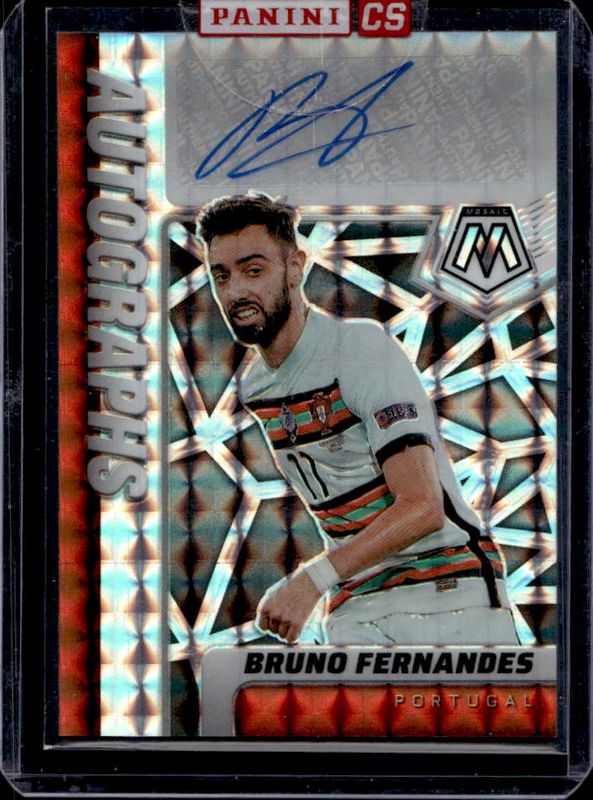 The Bruno Fernandes 2021 Mosaic Road to FIFA World Cup #A-BF Autographs card is 1 of 10 Bruno Fernandes' card variations in the 2021 Mosaic Road to FIFA World Cup set being tracked by Sports Card Investor, including Autographs Choice Fusion - Red, Autographs - Orange Fluorescent /50, Stained Glass /(SSP), Autographs - Gold /10, and Autographs - Pink Fluorescent /10.