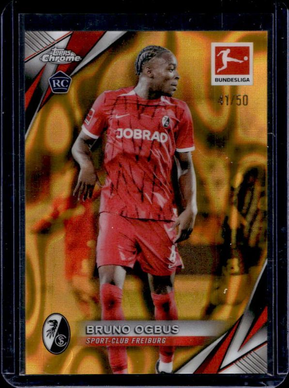 The Bruno Ogbus 2024 Topps Chrome Bundesliga #37 Gold Lava Refractor /50 card is 1 of 26 Bruno Ogbus' card variations in the 2024 Topps Chrome Bundesliga set being tracked by Sports Card Investor, including Base, Pulsar Refractor, Refractor, Neon Green Lava Refractor /250, and Neon Green Refractor /250.