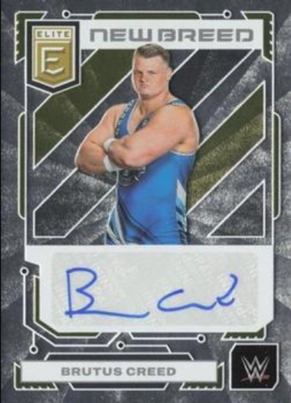 The Brutus Creed 2023 Elite WWE #NB-BCR New Breed Autographs card is 1 of 9 Brutus Creed's card variations in the 2023 Elite WWE set being tracked by Sports Card Investor, including Elite Impressions, New Breed Autographs - Green, New Breed Autographs - Red /49, New Breed Autographs - Blue /25, and Elite Impressions - Gold /10.