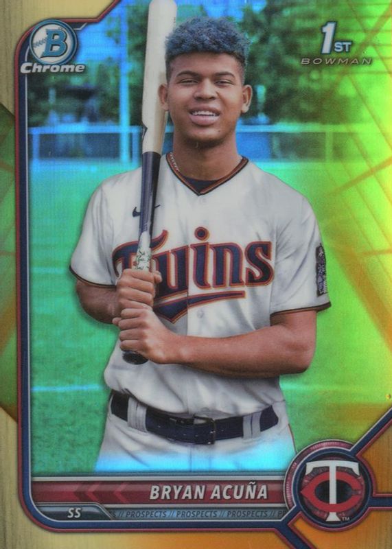 This card is 1 of 25 Bryan Acuna's card variations in the 2022 Bowman Chrome set being tracked by Sports Card Investor, including Prospects (1st), Prospects - Black & White Mini-Diamond Refractor (1st), Prospects - Shimmer Refractor (1st), Prospects - Refractor /499 (1st), and Prospects - Speckle Refractor /299 (1st).