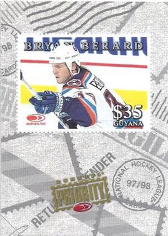 The Bryan Berard 1997 Donruss Priority Stamps card is 1 of 10 Bryan Berard's card variations in the 1997 Donruss Priority set being tracked by Sports Card Investor, including #194 Base, #54 Base, #54 Stamp of Approval /100, #194 Stamp of Approval /100, and #25 Postcards.
