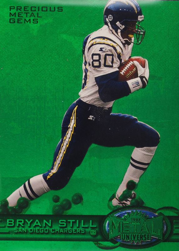 Bryan Still's Football cards are available in at least 8 sets. Bryan Still's biggest 7-day price movers are 1997 Metal Universe #152 Precious Metal Gems Green /15, 1997 Metal Universe #152 Precious Metal Gems Red /135, and 1998 SPx Finite #263 Base /7200.