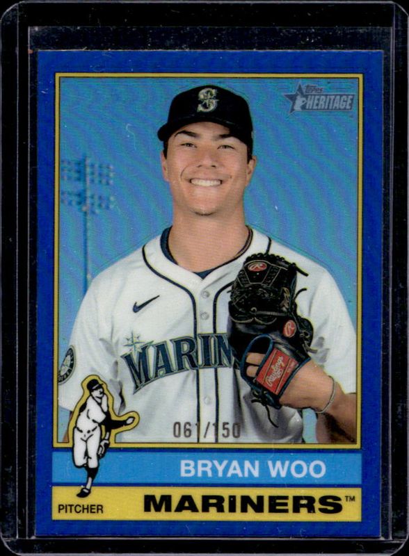 The Bryan Woo 2025 Topps Heritage #494 Chrome - Blue Refractor /150 card is 1 of 24 Bryan Woo's card variations in the 2025 Topps Heritage set being tracked by Sports Card Investor, including Base, Black Border, Dark Blue Border, Dark Green Border, and Dark Yellow Border.