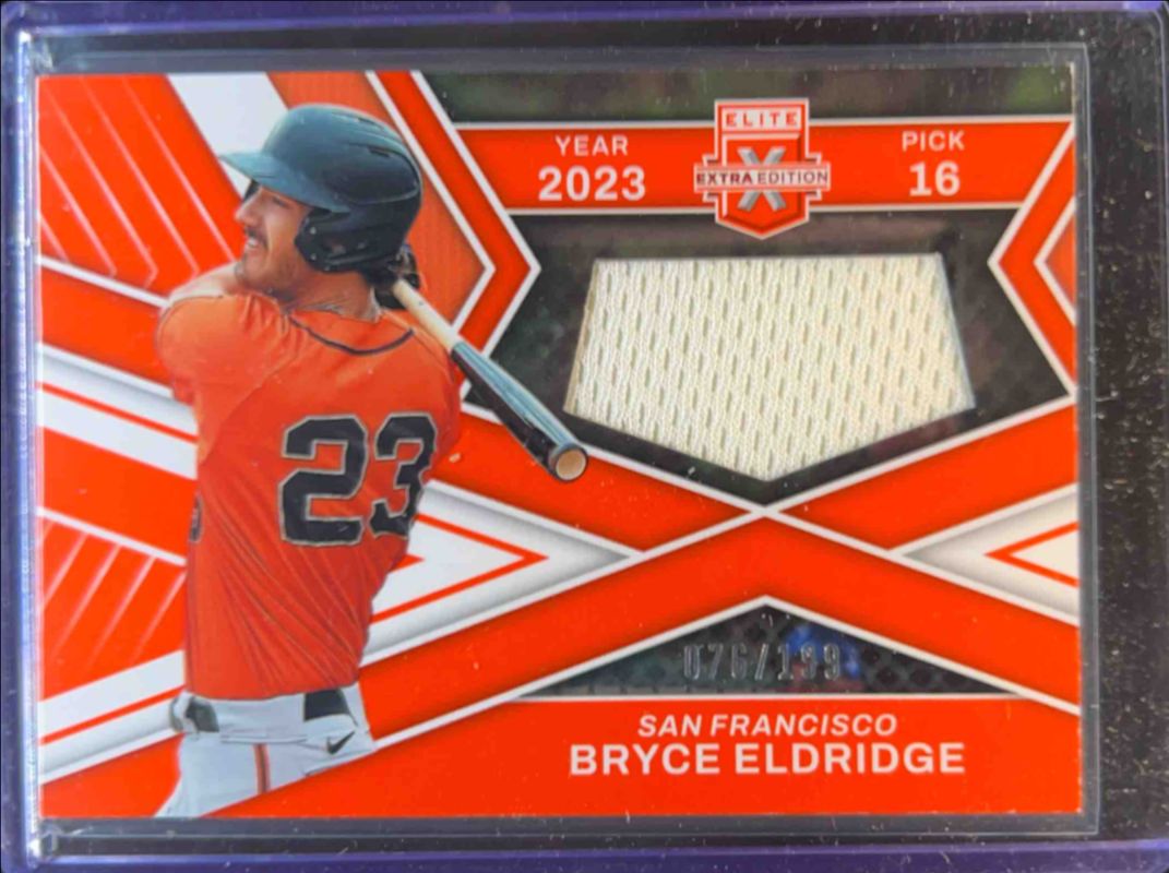 The Bryce Eldridge 2023 Elite Extra Edition #FR-BEL First Round Materials - Orange /199 card is 1 of 111 Bryce Eldridge's card variations in the 2023 Elite Extra Edition set being tracked by Sports Card Investor, including #13 Base, #152 Base, #13 Pink, #152 Pink, and #13 Signatures.