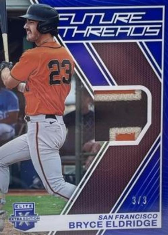 The Bryce Eldridge 2023 Elite Extra Edition #FT-BE Future Threads - Blue /3 card is 1 of 111 Bryce Eldridge's card variations in the 2023 Elite Extra Edition set being tracked by Sports Card Investor, including #13 Base, #152 Base, #13 Pink, #152 Pink, and #13 Signatures.
