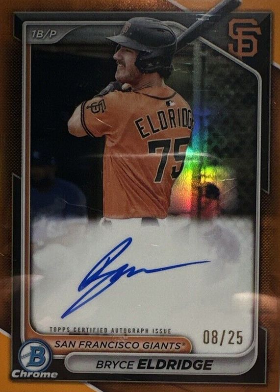 The Bryce Eldridge 2024 Bowman #CPA-BE Chrome Prospect Auto - Orange Refractor /25 card in Raw condition has not changed in price in the last 30 days and was last sold for $78.89 .