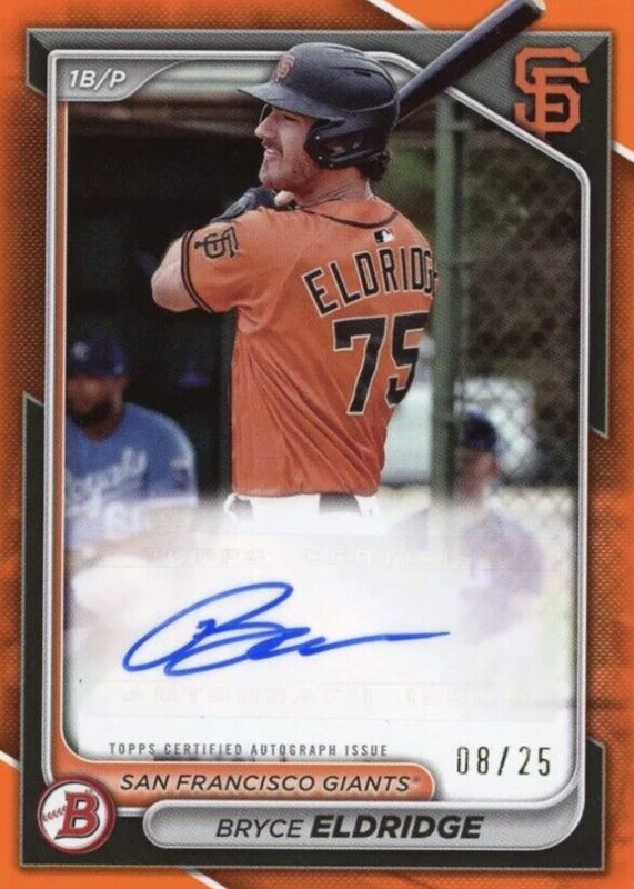 The Bryce Eldridge 2024 Bowman #PPRA-BE Paper Prospect Auto - Orange Border /25 card in Raw condition has not changed in price in the last 30 days and was last sold for $139.95 .