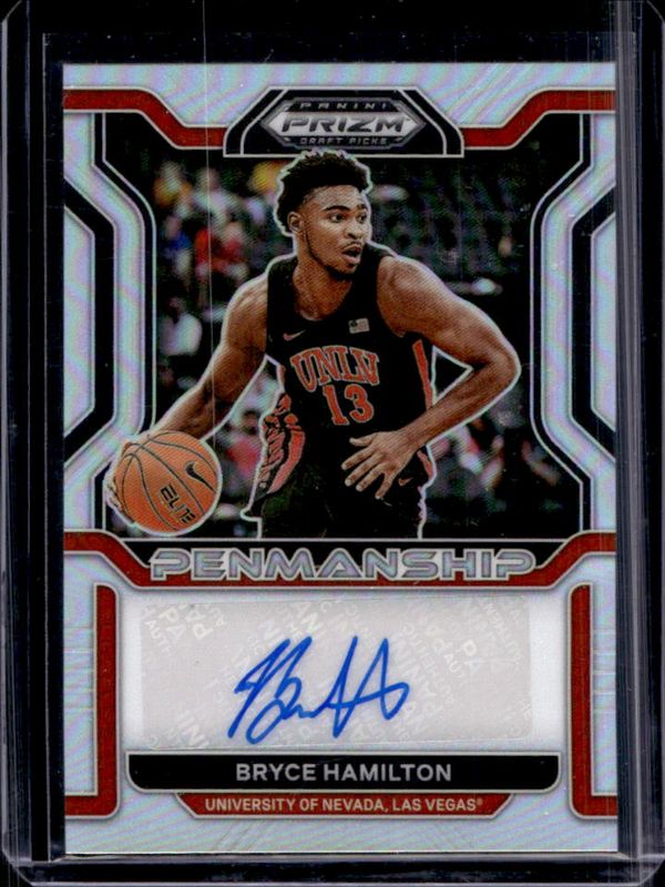 The Bryce Hamilton 2022 Prizm Draft Picks #CP-BHA College Penmanship - Silver card is 1 of 22 Bryce Hamilton's card variations in the 2022 Prizm Draft Picks set being tracked by Sports Card Investor, including College Penmanship, College Penmanship - Green, College Penmanship - Hyper, College Penmanship - Red /199, and College Penmanship - Blue /149.